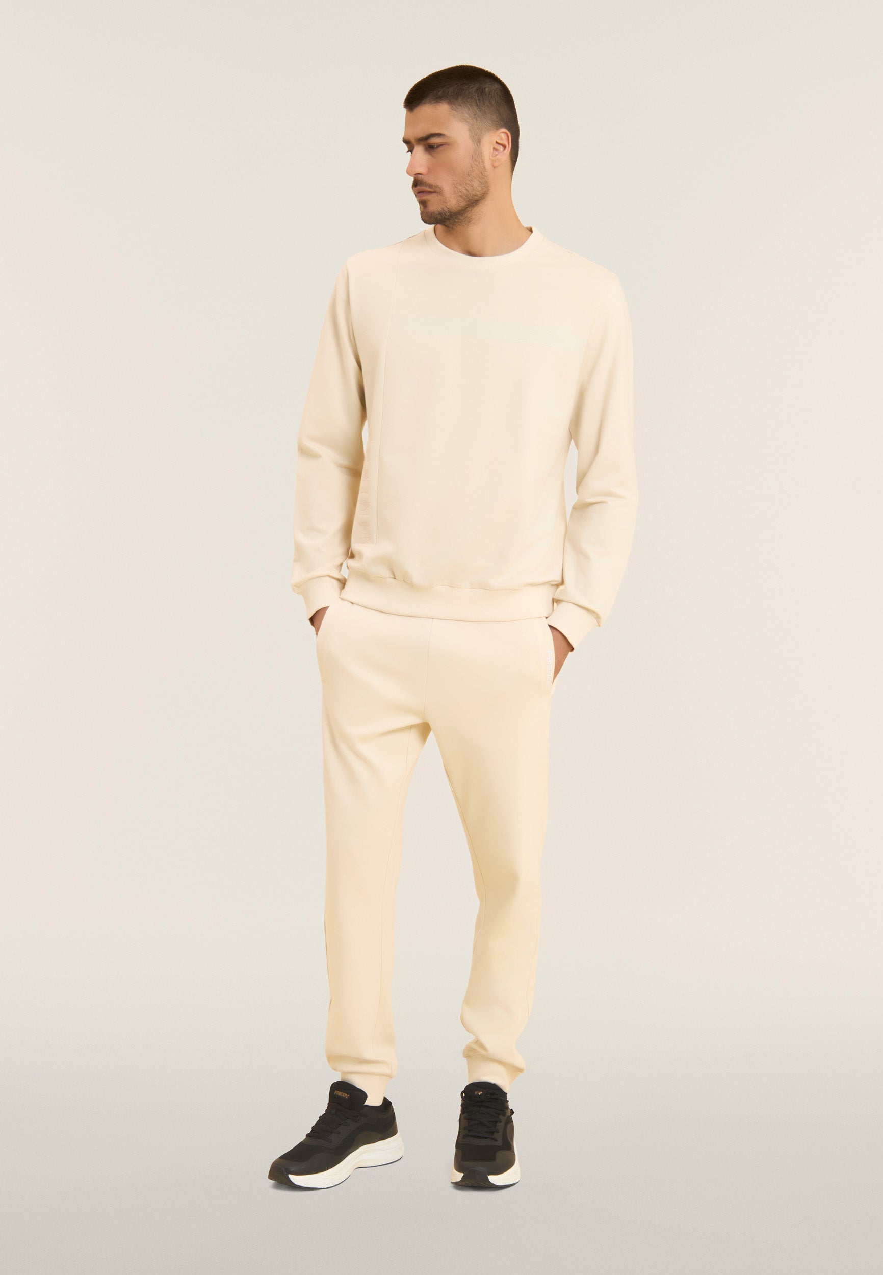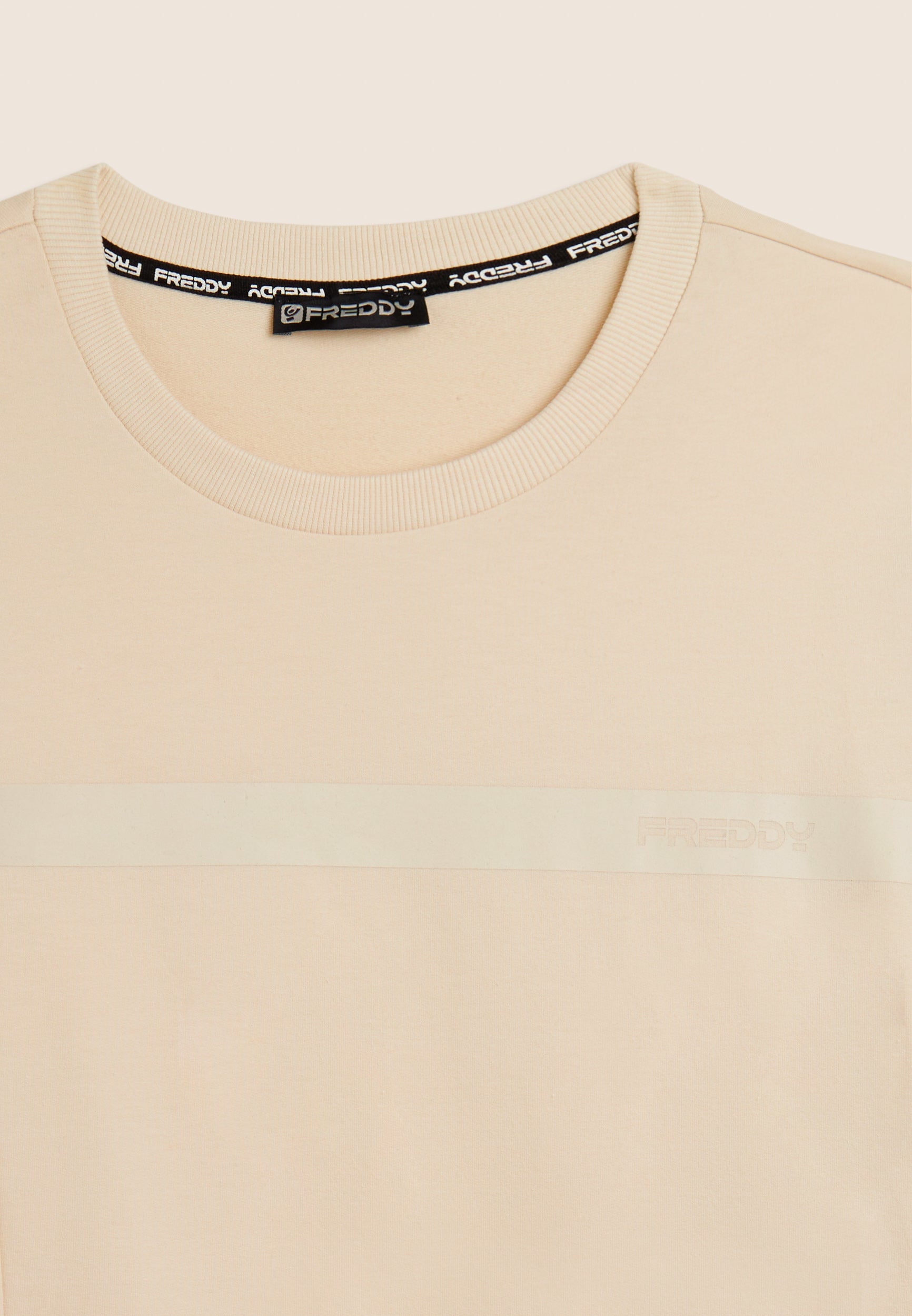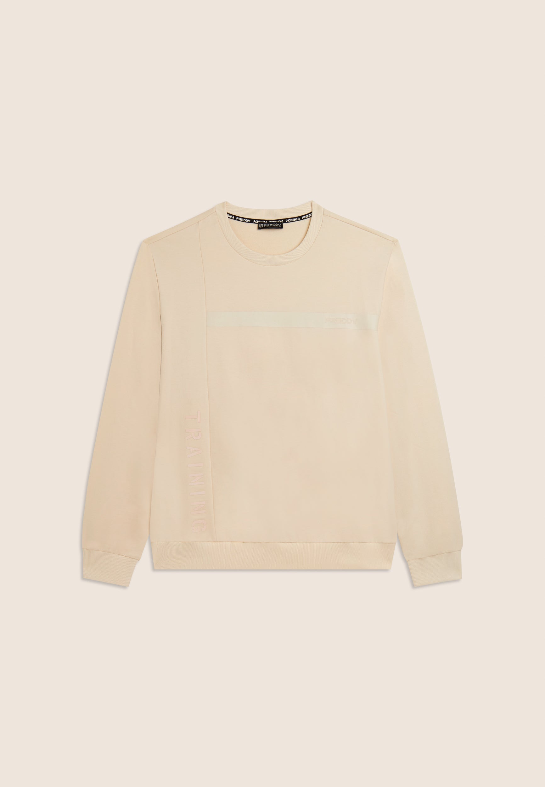 Men's sweatshirt in regular fit and length, made of Baby French Terry, a soft, slightly stretchy fabric perfect for everyday activity. The crew neck, cuffs and bottom band are ribbed for a stable and comfortable fit. The sporty design of the panel stitching is enhanced by the FREDDY logo band on the chest and the vertical 'TRAINING' lettering on the right side, both printed tone-on-tone with a rubberised effect for a technical and modern look.