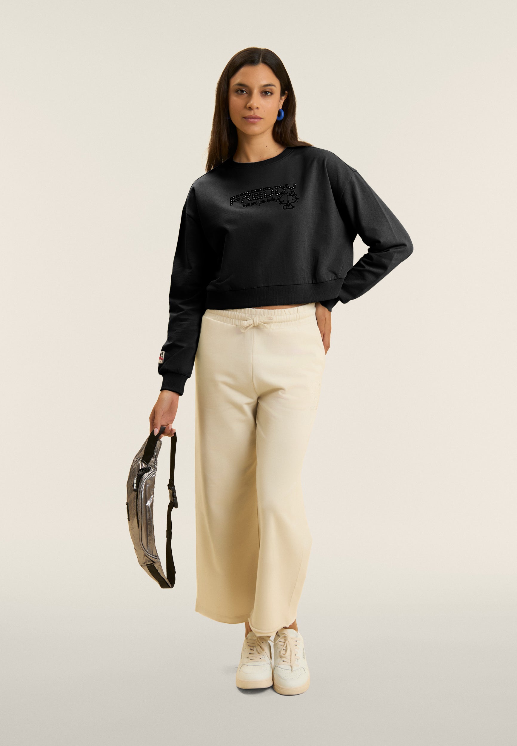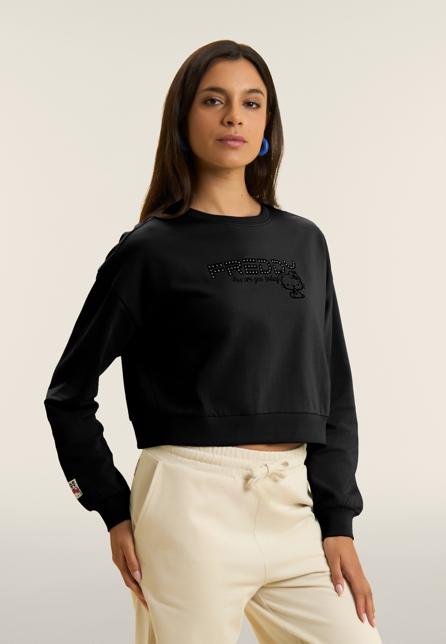 Comfort-fit sweatshirt with cropped length, perfect for urban spirit looks. Made of 100% cotton French terry, it features a crew neck and ribbed bottom, long sleeves with dropped shoulder and cuffs for a relaxed but neat fit. Hello Kitty and the lettering “How are you today” stand out on the front, accompanied by the FREDDY logo decorated with studs. A perfect mix of pop sweetness and metropolitan character.