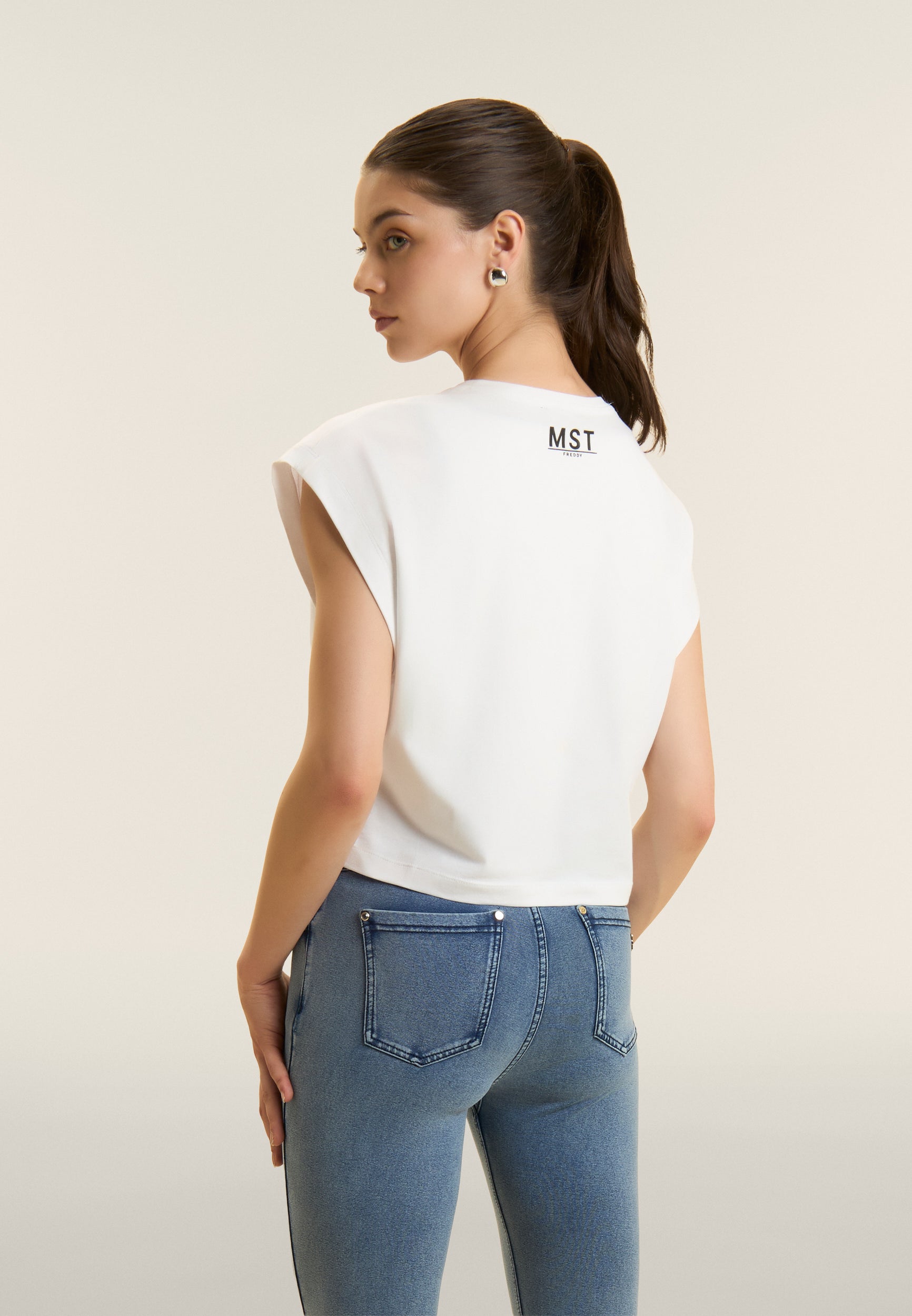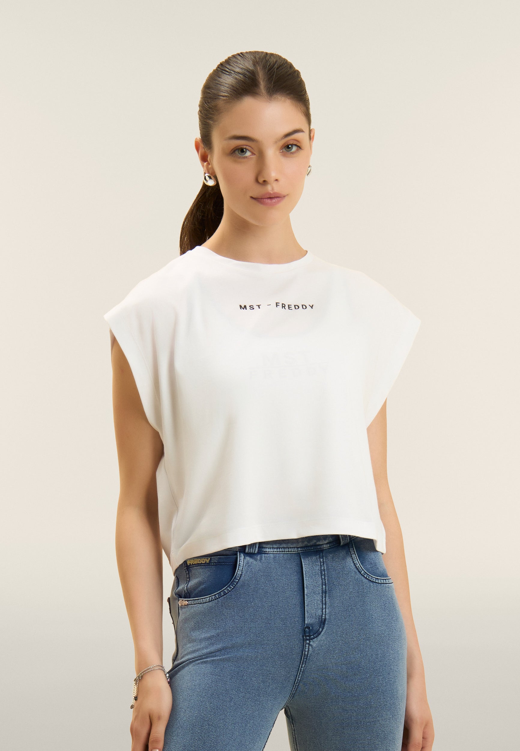 Short sleeve t-shirt with comfortable fit and cropped length, made of stretch cotton jersey, which guarantees a soft and comfortable fit. The straight bottom and very short cap sleeves create a casual yet sophisticated look. Small MST FREDDY prints on the chest and under the back neckline add a distinctive touch. A versatile garment, ideal for a simple yet elegant look, perfectly suited to both leisure and sporty outfits.