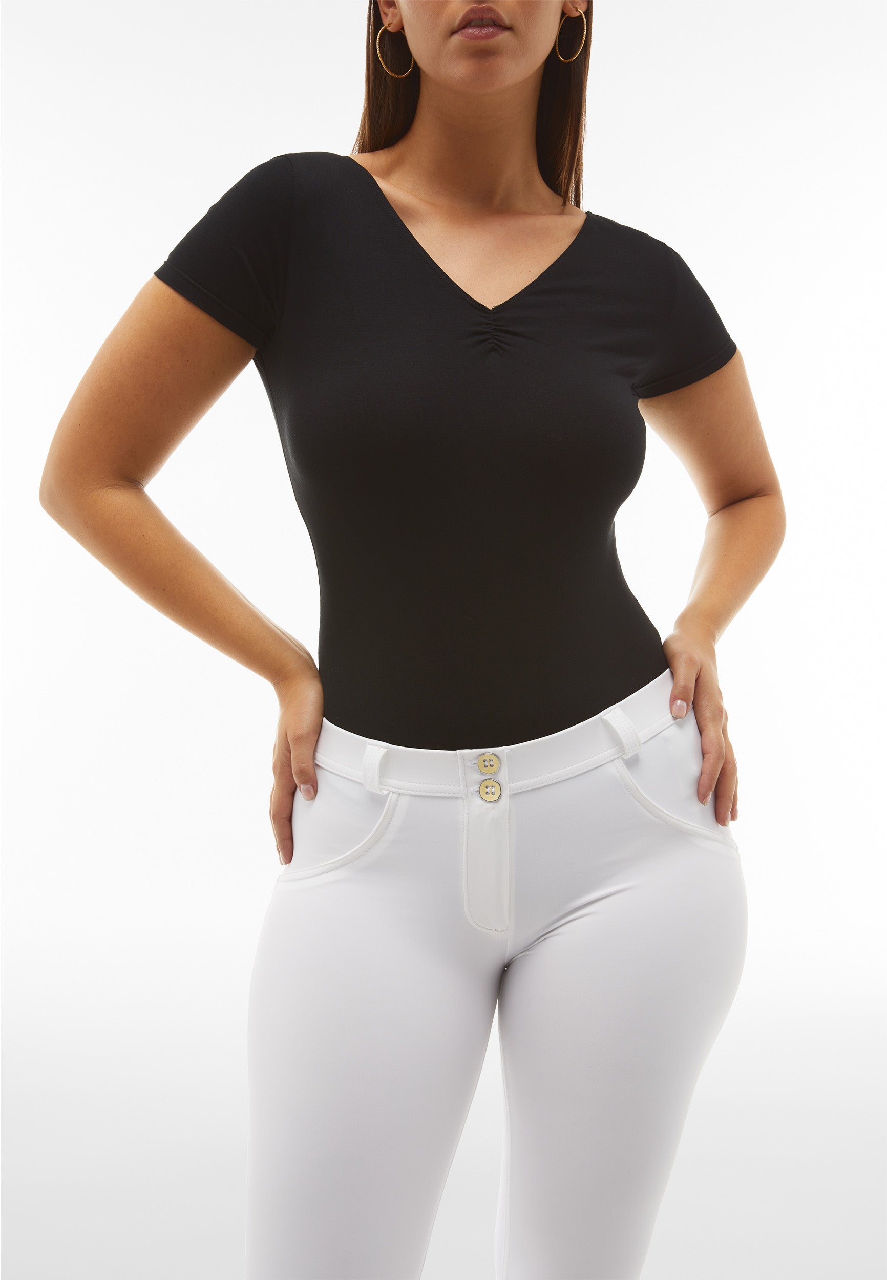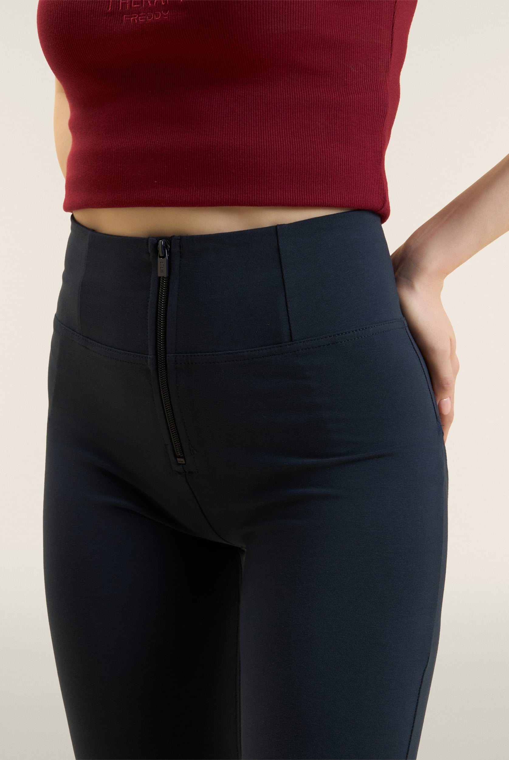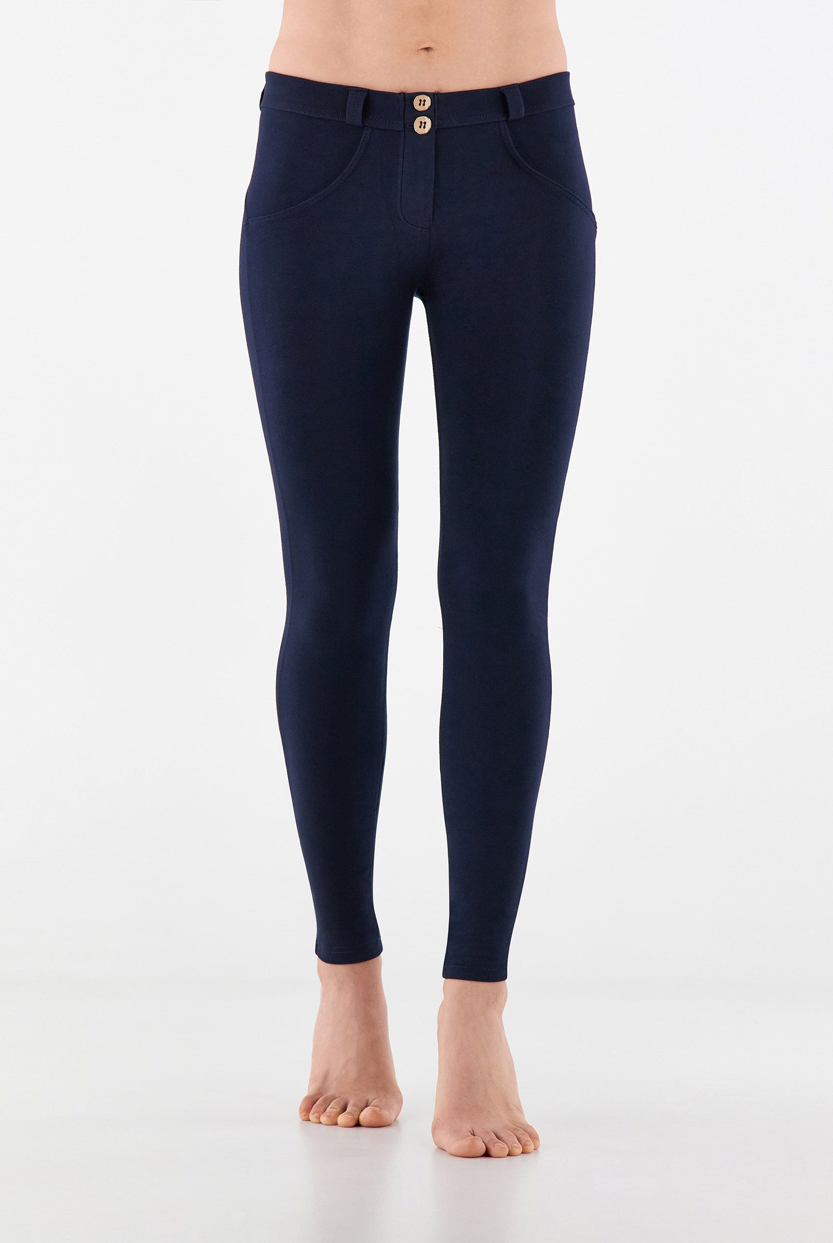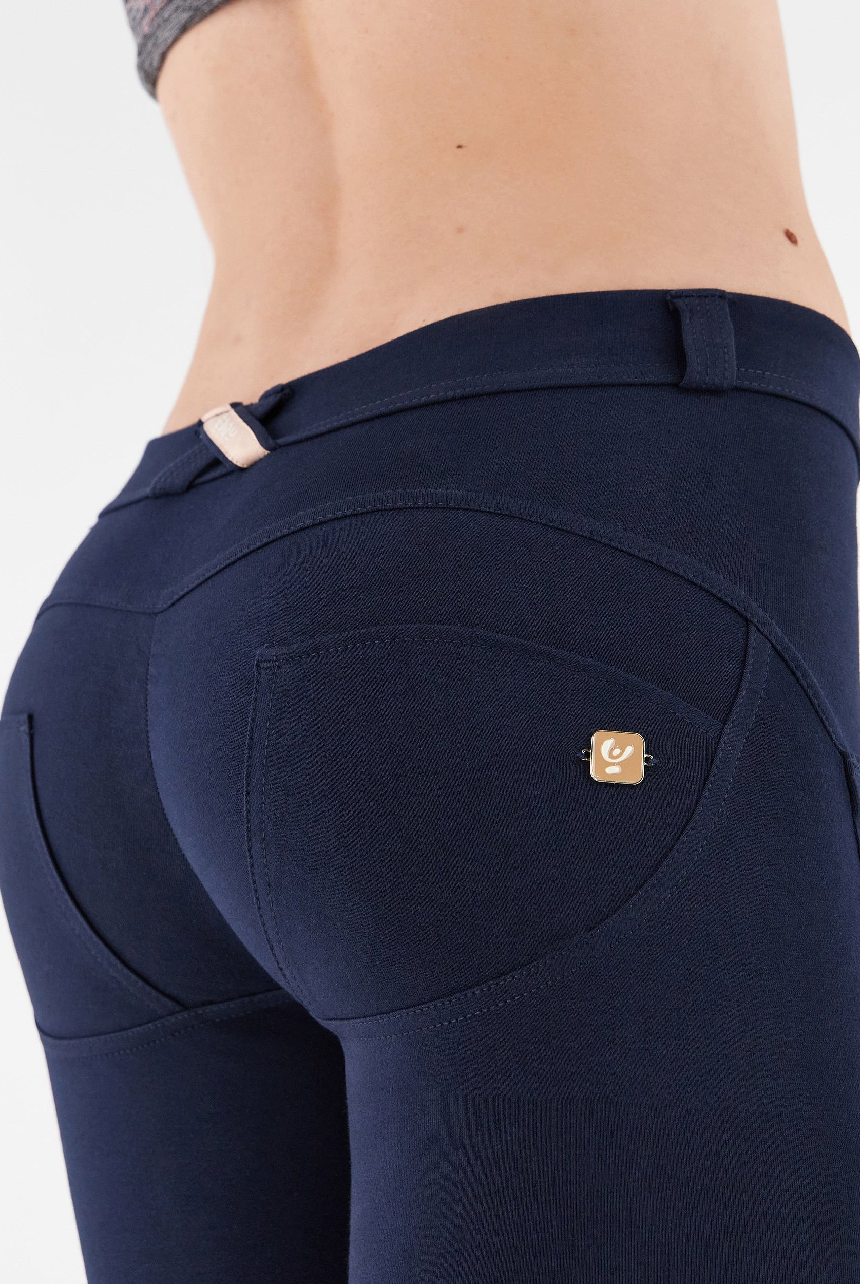 Die Mid-Waist-Modelle sitzen zwischen der Taille und dem Bauchnabel. Alle unsere mittlere Jeans haben vorne drei Freddy-typische Knöpfe. Sie sind etwas höher als unsere Regular-Waist-Hosen, aber nicht ganz so hoch, wie die High-Waist-Modelle. Sie haben einen bequemen, hohen Bund ohne Silikonstreifen, und die Knöpfe sorgen für einen perfekten Sitz. Jeans in Mid Waist eignen sich vor allem für kurvigere Frauen, die mehr Stütze und Form für den Bauch und die Taille möchten. Zusätzlich zaubern die Hosen natürlich den perfekten Po.