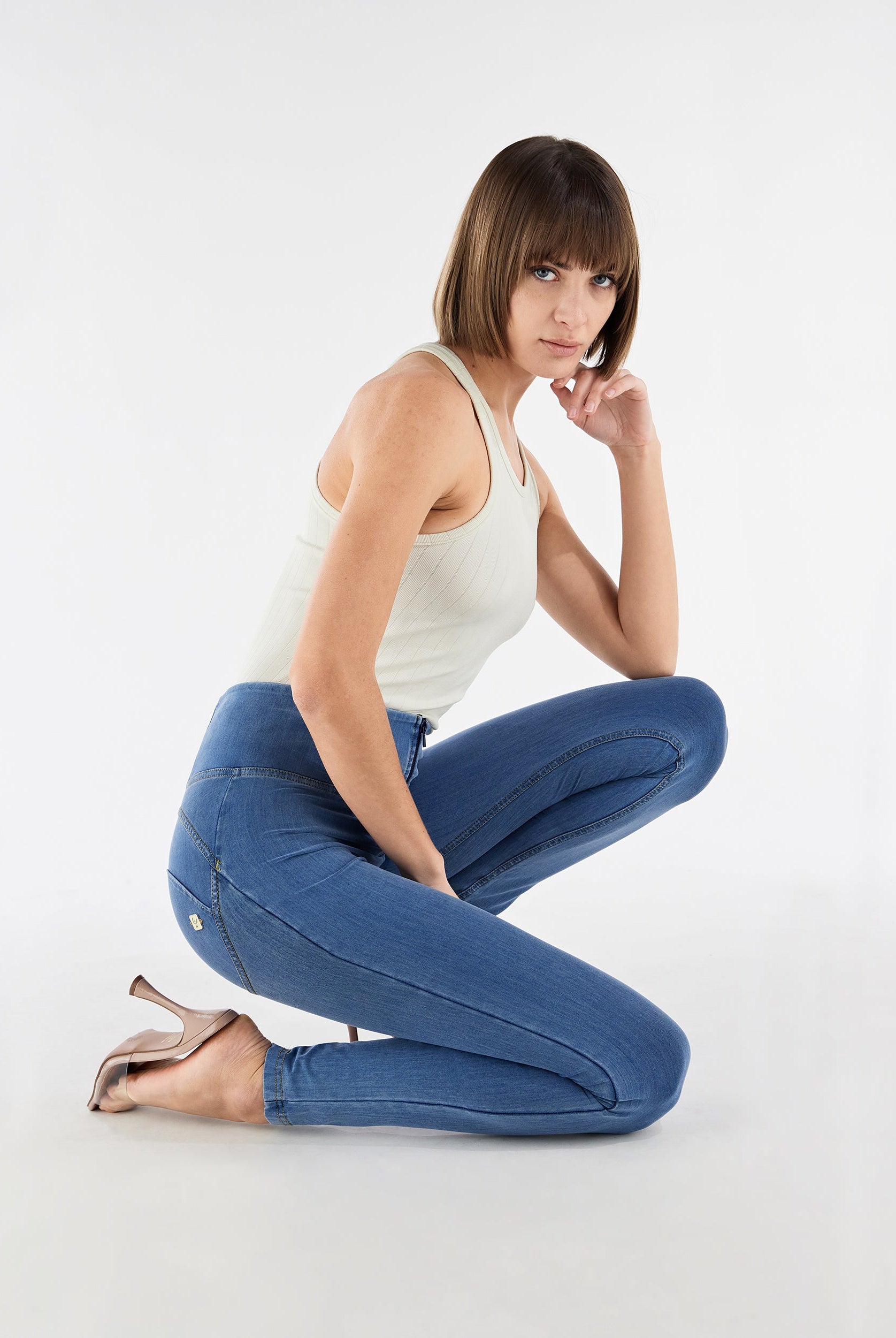 Die Mid-Waist-Modelle sitzen zwischen der Taille und dem Bauchnabel. Alle unsere mittlere Jeans haben vorne drei Freddy-typische Knöpfe. Sie sind etwas höher als unsere Regular-Waist-Hosen, aber nicht ganz so hoch, wie die High-Waist-Modelle. Sie haben einen bequemen, hohen Bund ohne Silikonstreifen, und die Knöpfe sorgen für einen perfekten Sitz. Jeans in Mid Waist eignen sich vor allem für kurvigere Frauen, die mehr Stütze und Form für den Bauch und die Taille möchten. Zusätzlich zaubern die Hosen natürlich den perfekten Po.