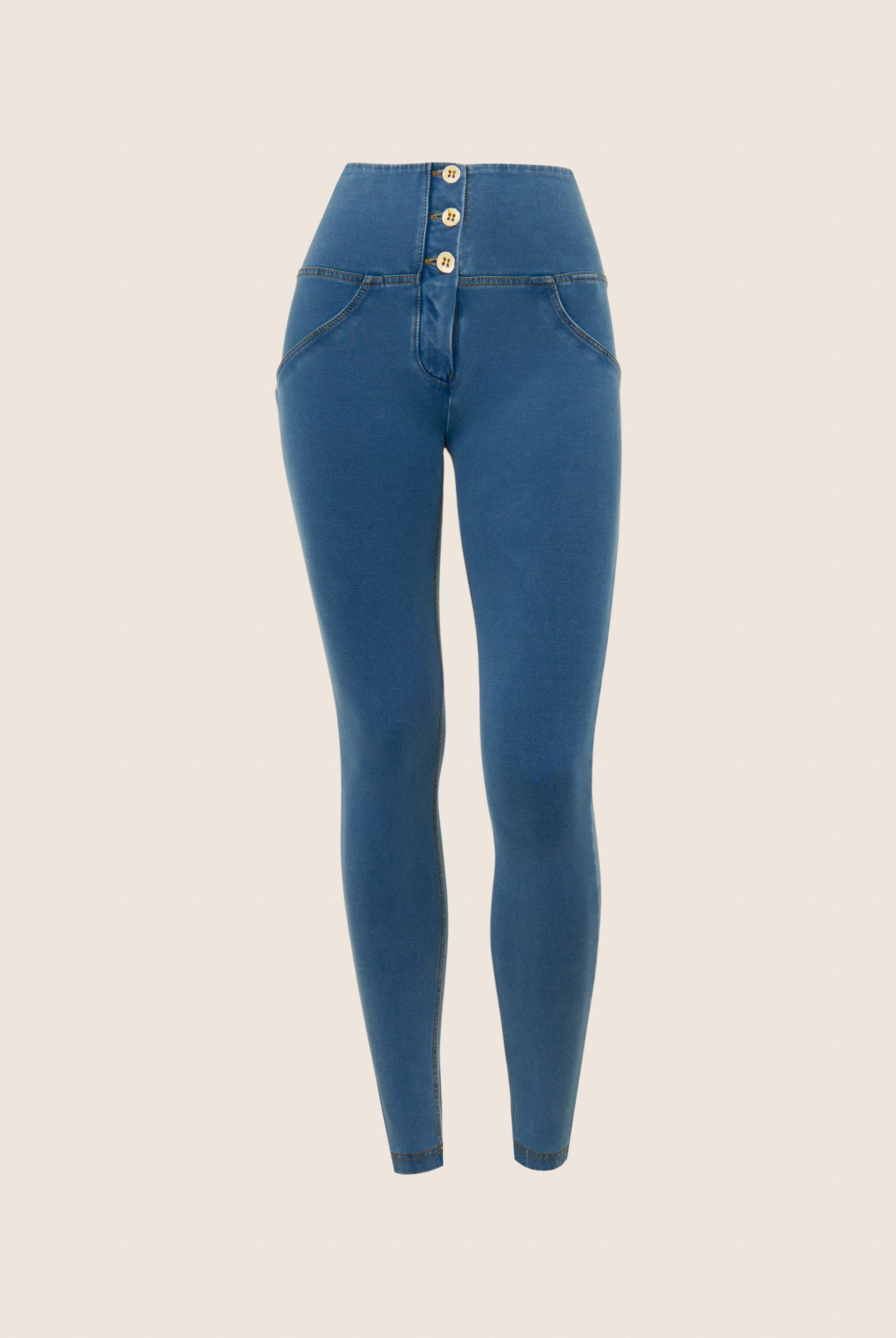 WR.UP Push-Up Button High Waist Skinny Denim Jeans - Denim Light Blue - Yellow Seam