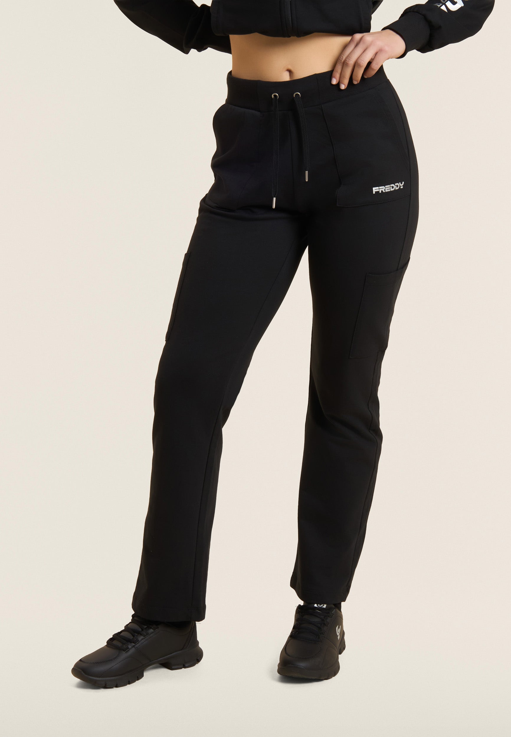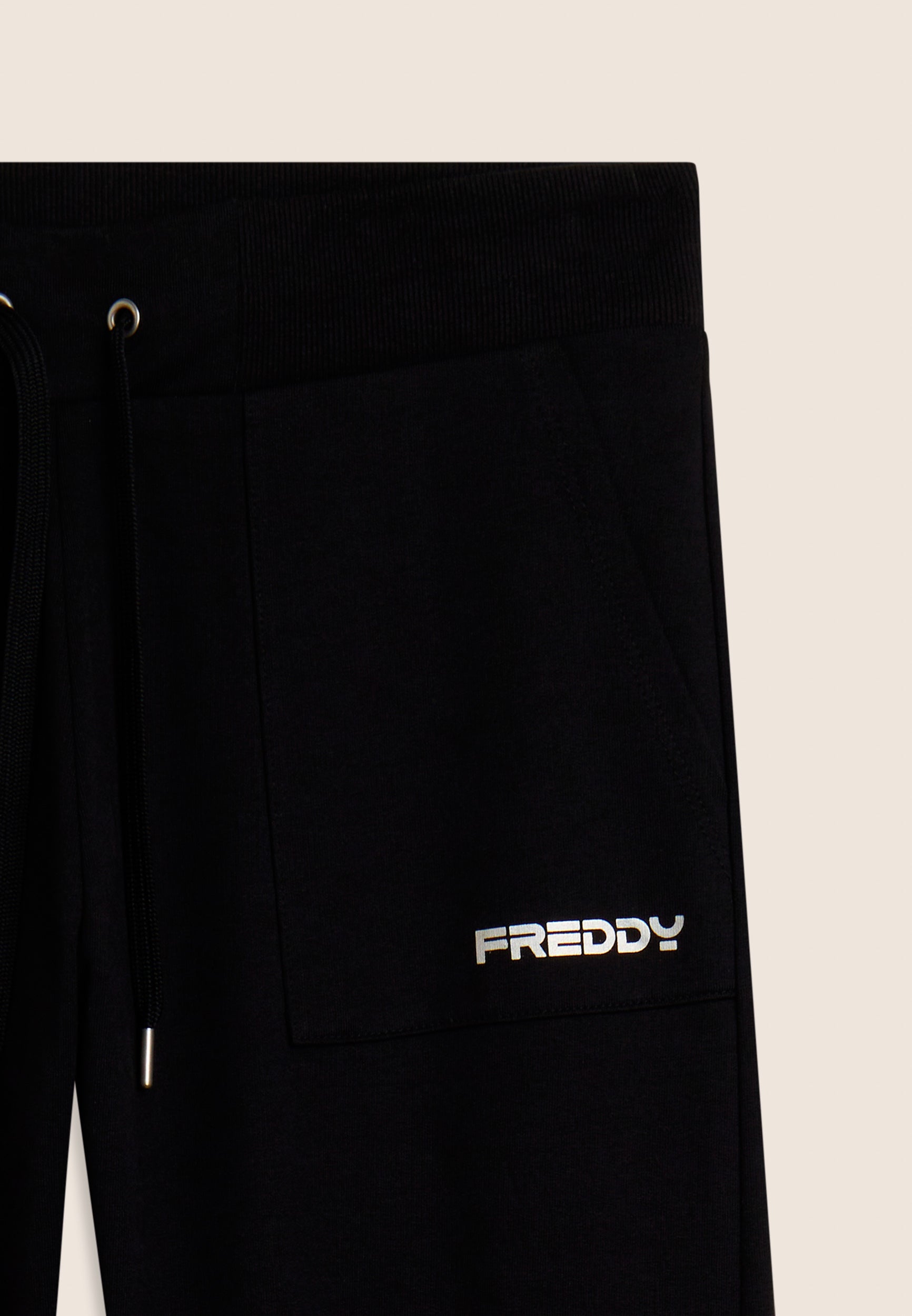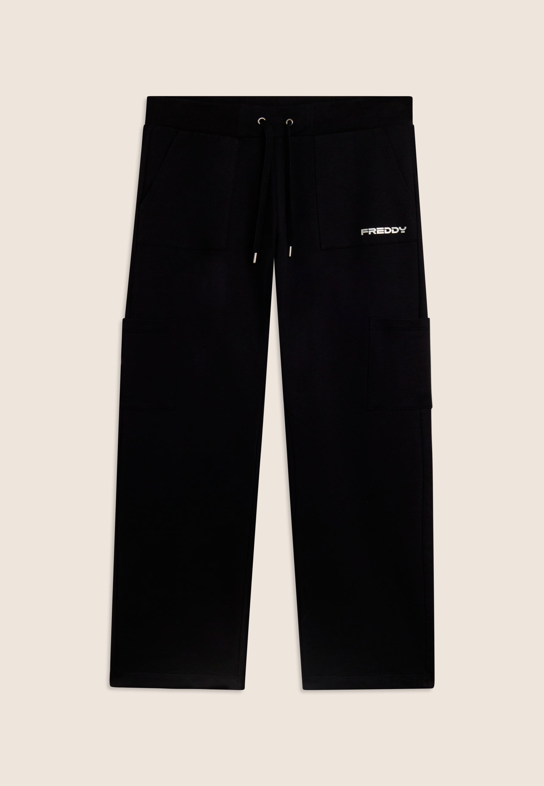 Athletic trousers in heavy cotton stretch jersey, designed to provide comfort and functionality during everyday activities. The model has a regular fit and length, with a regular waist finished with a ribbed waistband with adjustable drawstring. The leg is straight with a regular bottom for a natural fit. Camp pockets on the hips and along the leg add practicality and a utility touch, and the small FREDDY logo with pearl finish on the left pocket completes the look with discreet elegance.