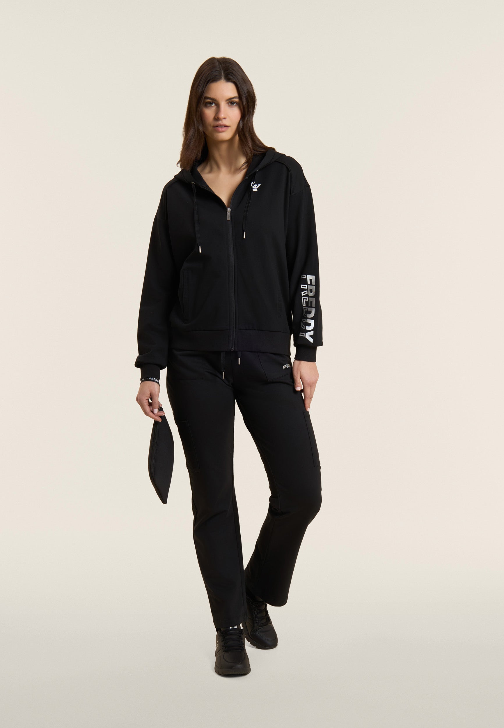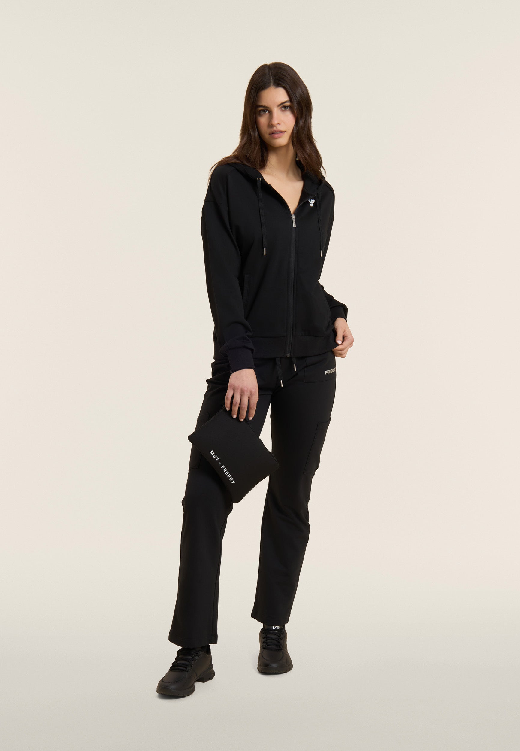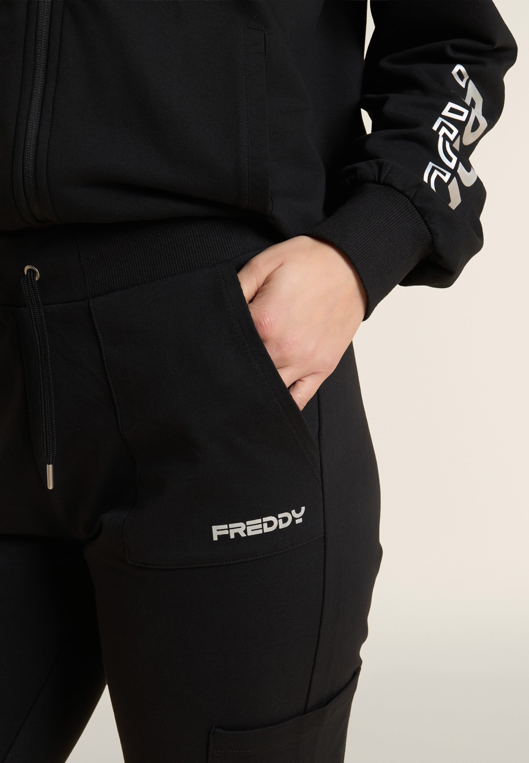 Athletic trousers in heavy cotton stretch jersey, designed to provide comfort and functionality during everyday activities. The model has a regular fit and length, with a regular waist finished with a ribbed waistband with adjustable drawstring. The leg is straight with a regular bottom for a natural fit. Camp pockets on the hips and along the leg add practicality and a utility touch, and the small FREDDY logo with pearl finish on the left pocket completes the look with discreet elegance.