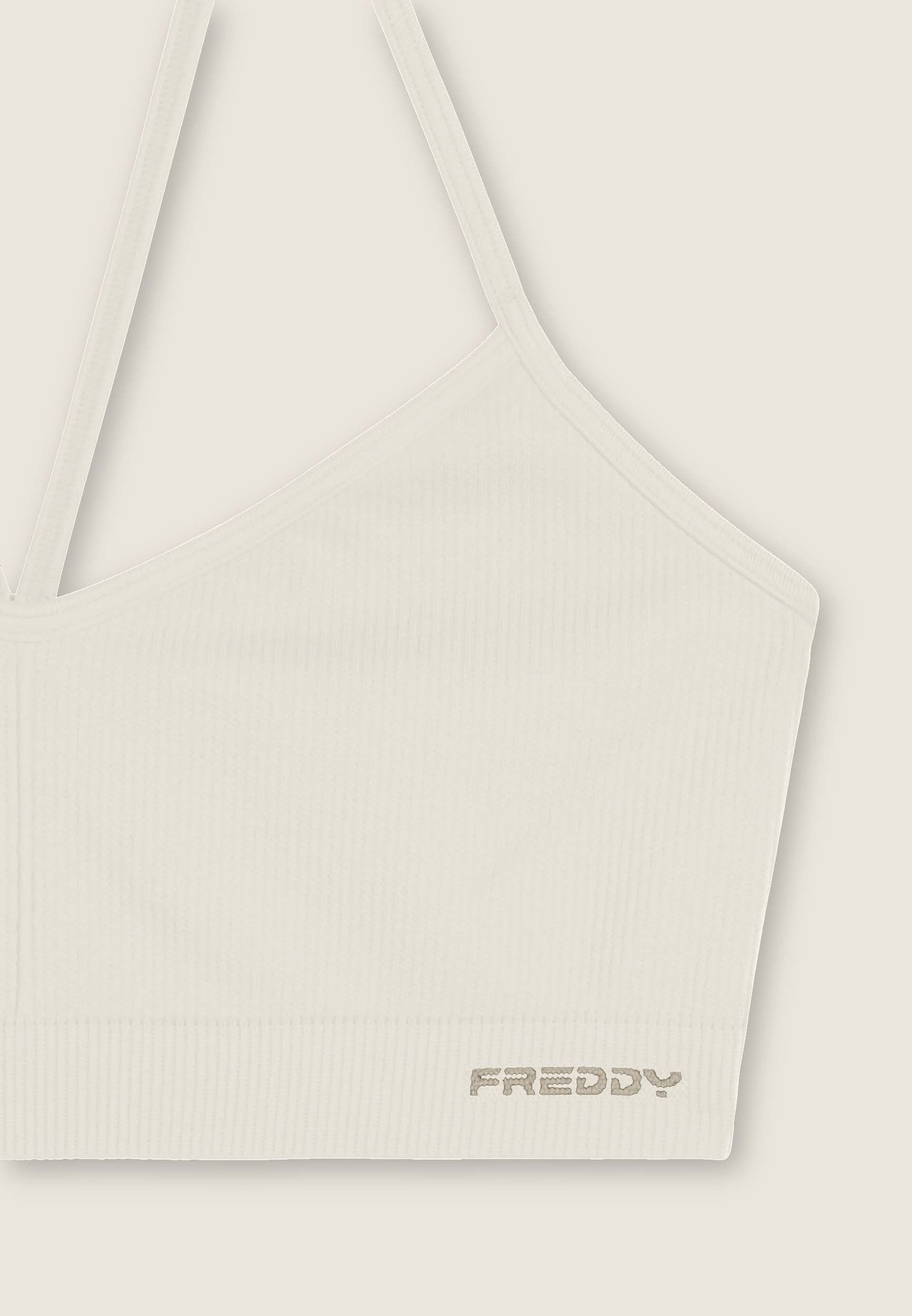 Medium support sports bra, ideal for variable intensity training. Made from seamless ribbed fabric, it seamlessly follows the contours of the body to provide total comfort. The design includes a wide neckline and thin shoulder straps crossed at the back, with a small FREDDY jacquard logo on the underbust band.