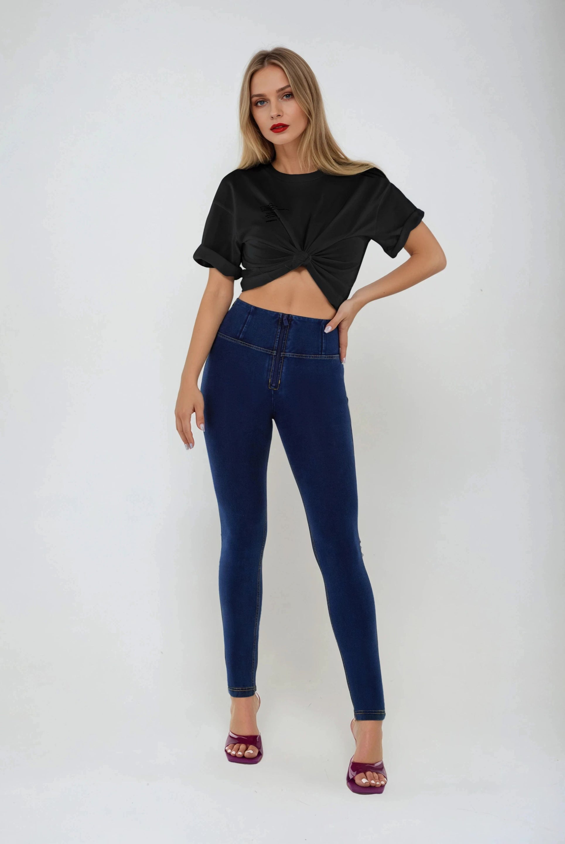 WR.UP® super skinny push-up 7/8 length trousers in heavy organic stretch cotton jersey. The decorative ribbons at the waist, fixed by large gold rivets, and the central stitching along the leg give the garment character and originality. High waist with central zip.