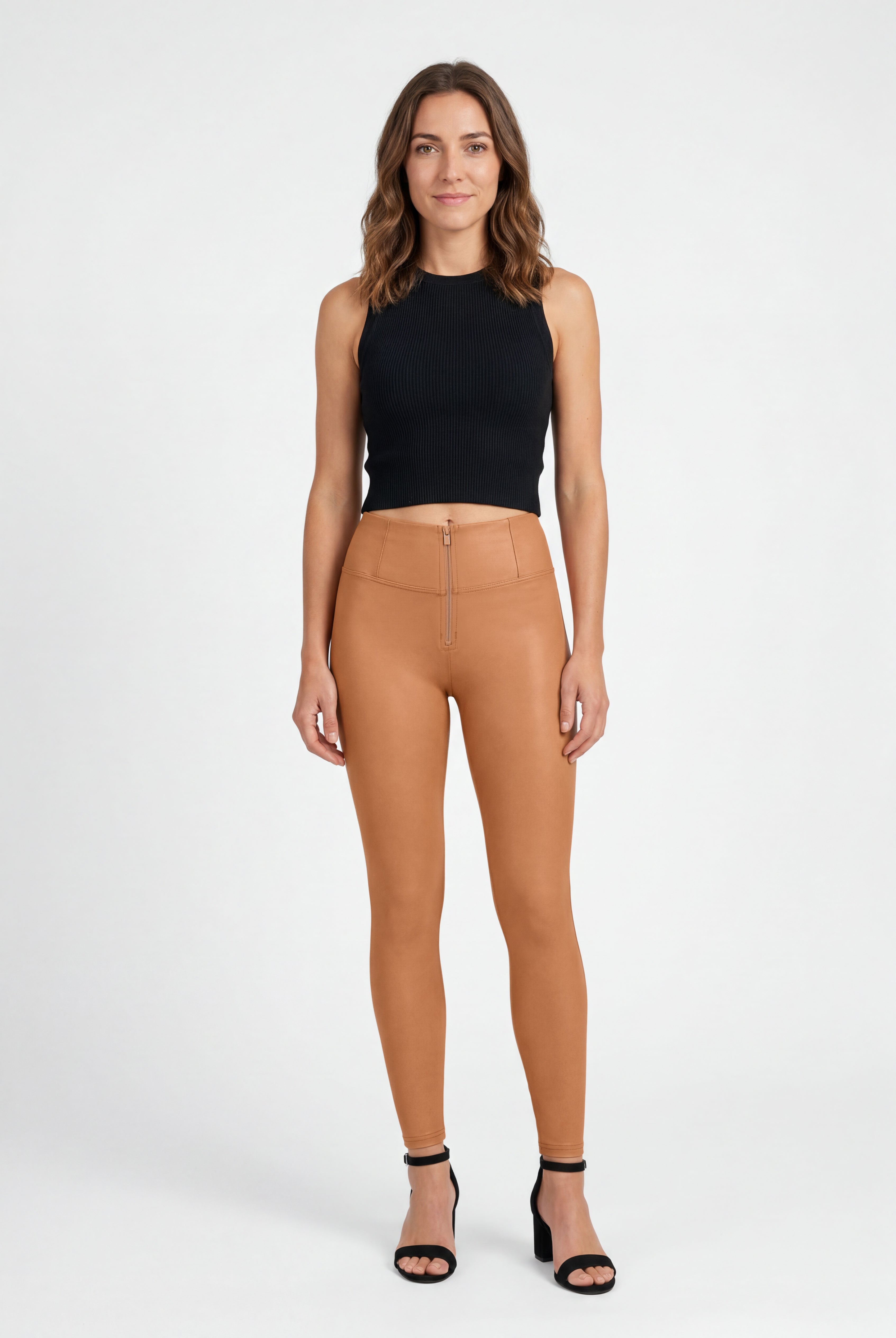WR.UP® Leather Effect Pants in Black: designed to flatter and move with you. They feature a sleek skinny fit that hugs your curves. Adding to that is a flattering high waist that offers gentle support. The look is completed by a timeless full length, perfect for any season. Crafted from a bold coated fabric for an edgy look with hidden stretch. As part of the WR.UP® line, they feature patented technology designed to naturally enhance and sculpt your silhouette. Italian design that radiates confidence and style.