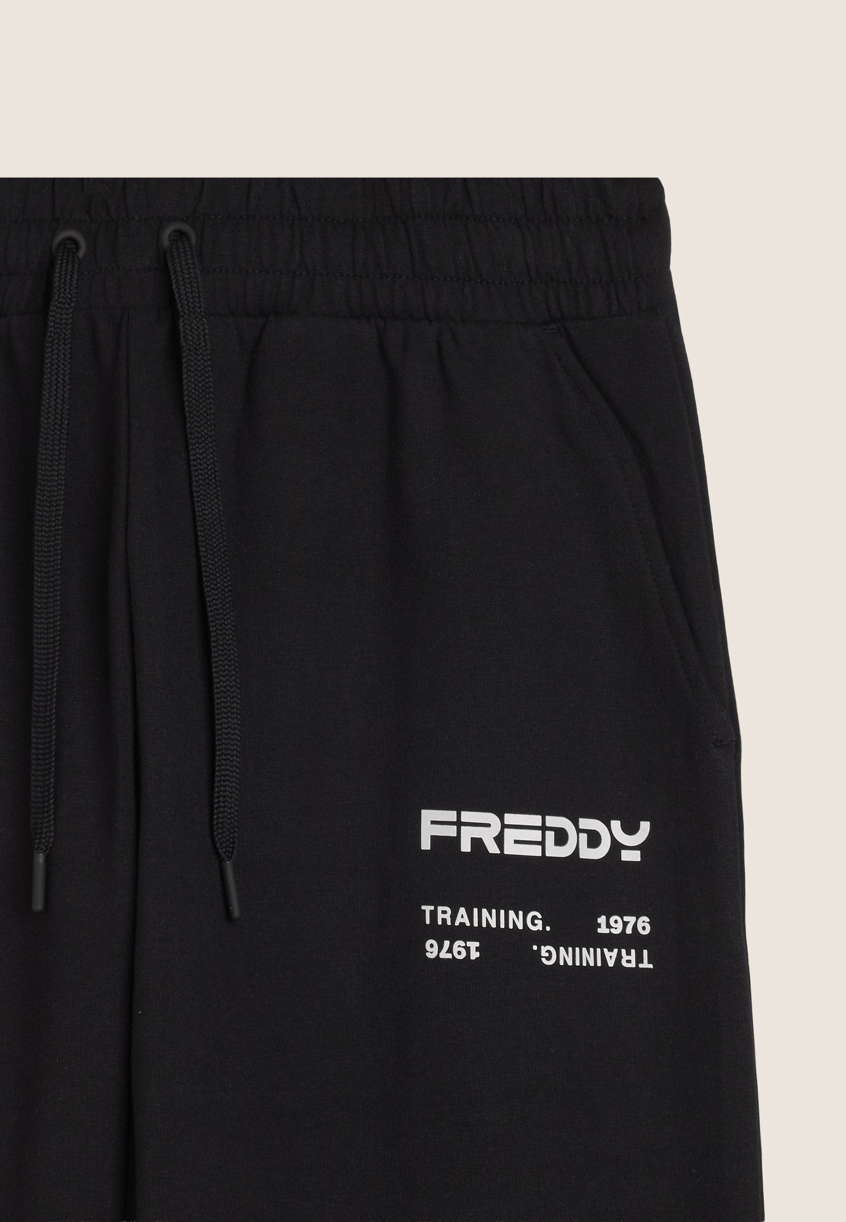 Men's athletic trousers in a regular fit and length, made of baby French Terry for maximum comfort. They feature a regular waist with inner elastic and drawstring for a customised fit, regular legs with panel stitching, and a ribbed cuff hem that enhances the line of the garment. Tone-on-tone side bands run from below the knee to the bottom of the leg, and the rubberised logo print on the left hip adds a distinctive, technical touch. Slant besom pockets and a back patch pocket complete the garment, ideal for everyday use and sports activities.