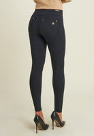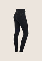 Discover the super skinny fit of these N.O.W. trousers in Organic Heavy Stretch Jersey, a sustainable and comfortable fabric that naturally moulds to the shape. The zipless high waist is embellished by crossed bands on the hips that add a distinctive touch to the design. The FREDDY lurex embroidered logo and the “small man” plaque on the back pocket enhance the garment, while the jeans-style pockets with rivets complete the look with a casual yet sophisticated detail.