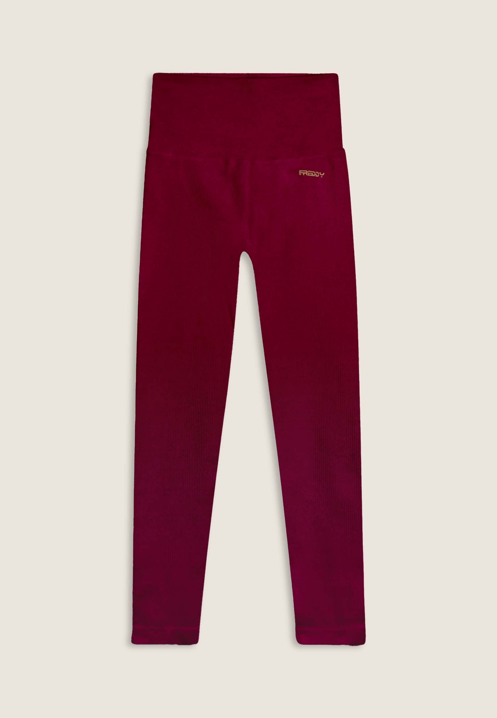 Sports leggings with 7/8 length and skinny leg, made from seamless ribbed fabric for absolute comfort. The very high waist guarantees a stable hold during training, while the heart-shaped seams on the buttocks naturally enhance the shape. Finished with a FREDDY logo on the front and “small man” logo on the back.