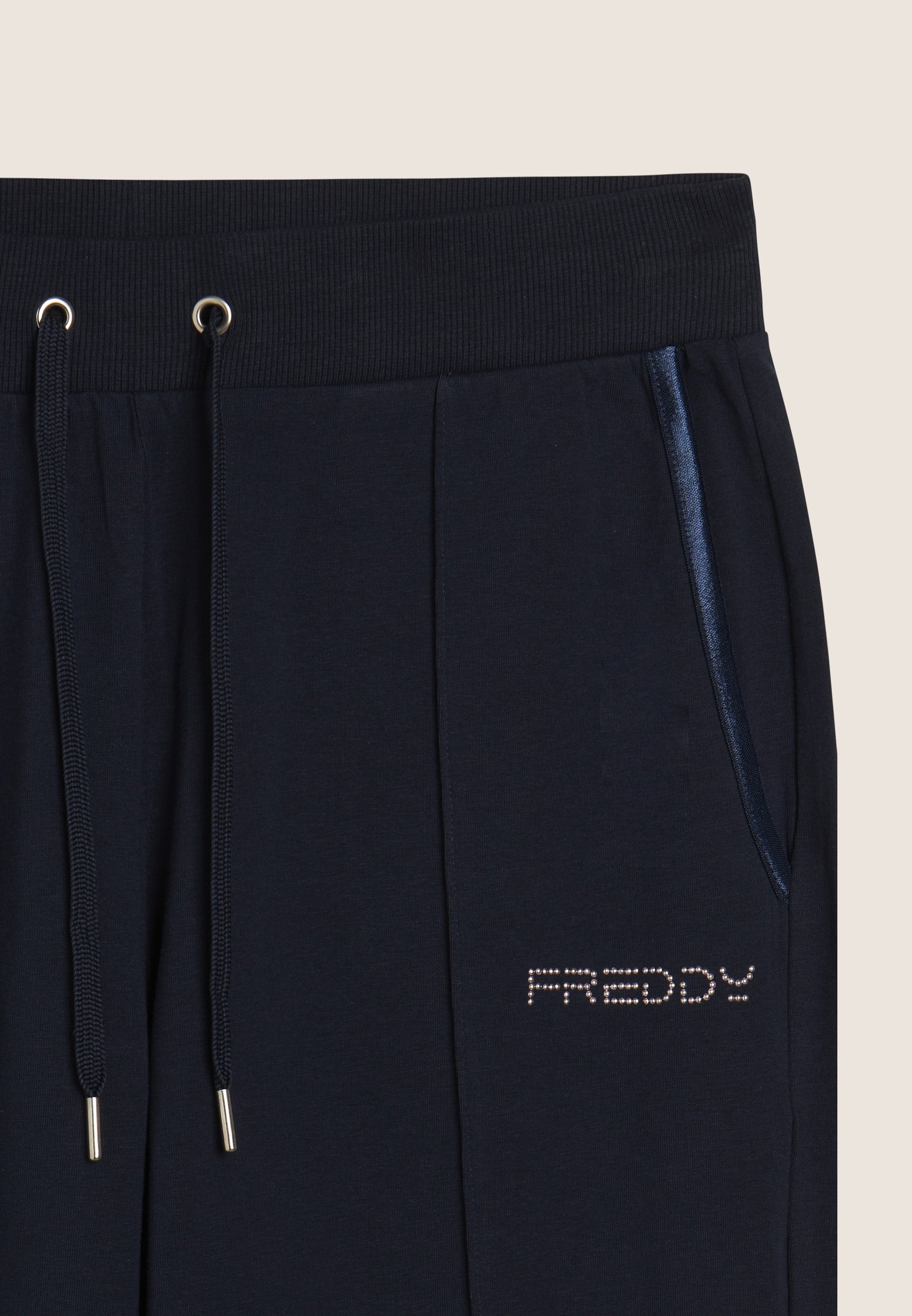 Athletic trousers with a slim fit and straight leg, ideal for a modern, dynamic look. The regular waist with ribbed band and drawstring ensures a perfect fit. The FREDDY logo in light pink beads on the front left hip and the decorative seam in the centre of the leg add a touch of elegance. Front pockets with opening edged with shiny elastic complete the design. Made of heavy cotton stretch jersey, they are perfect for light activities.