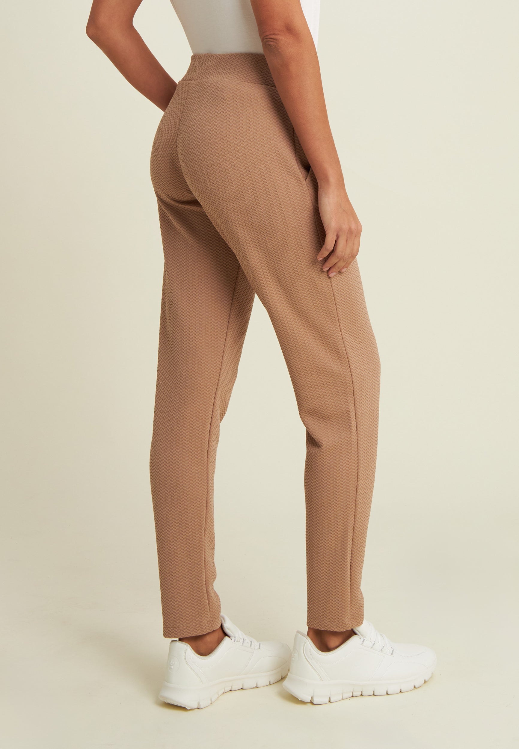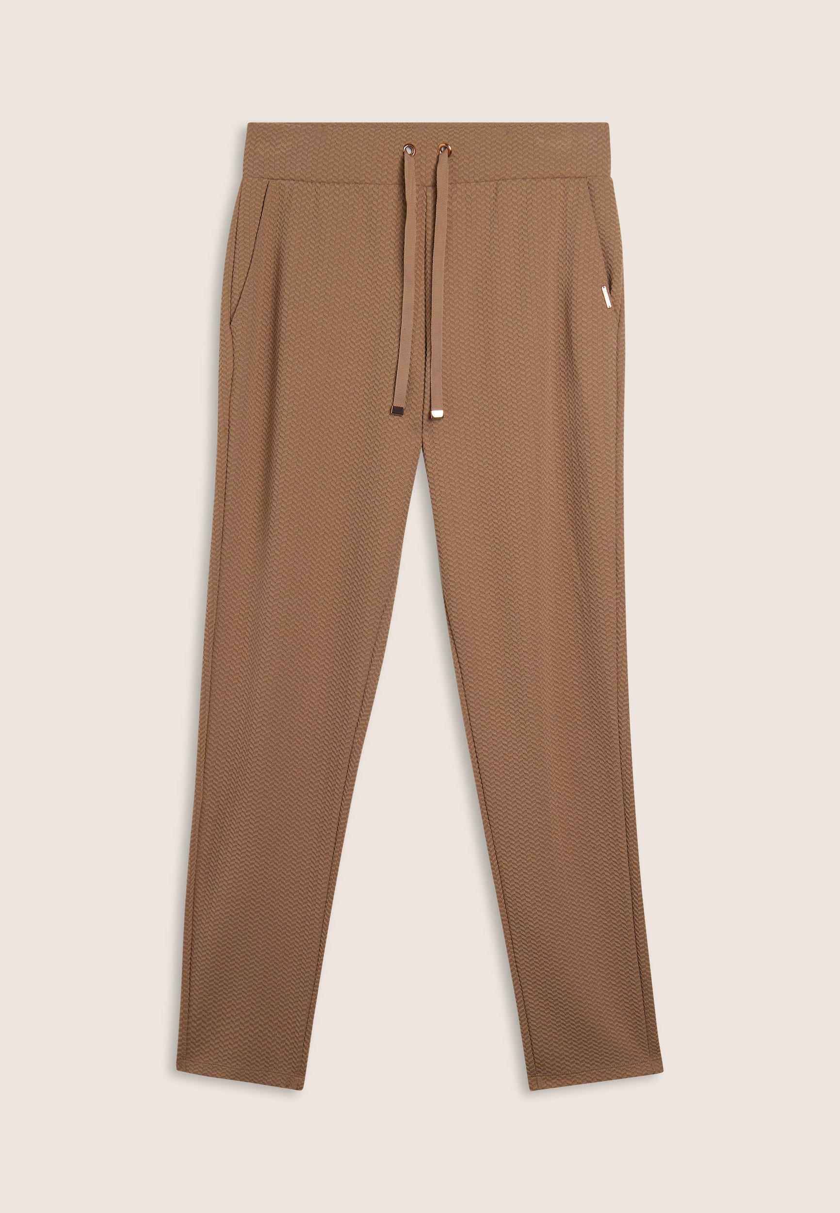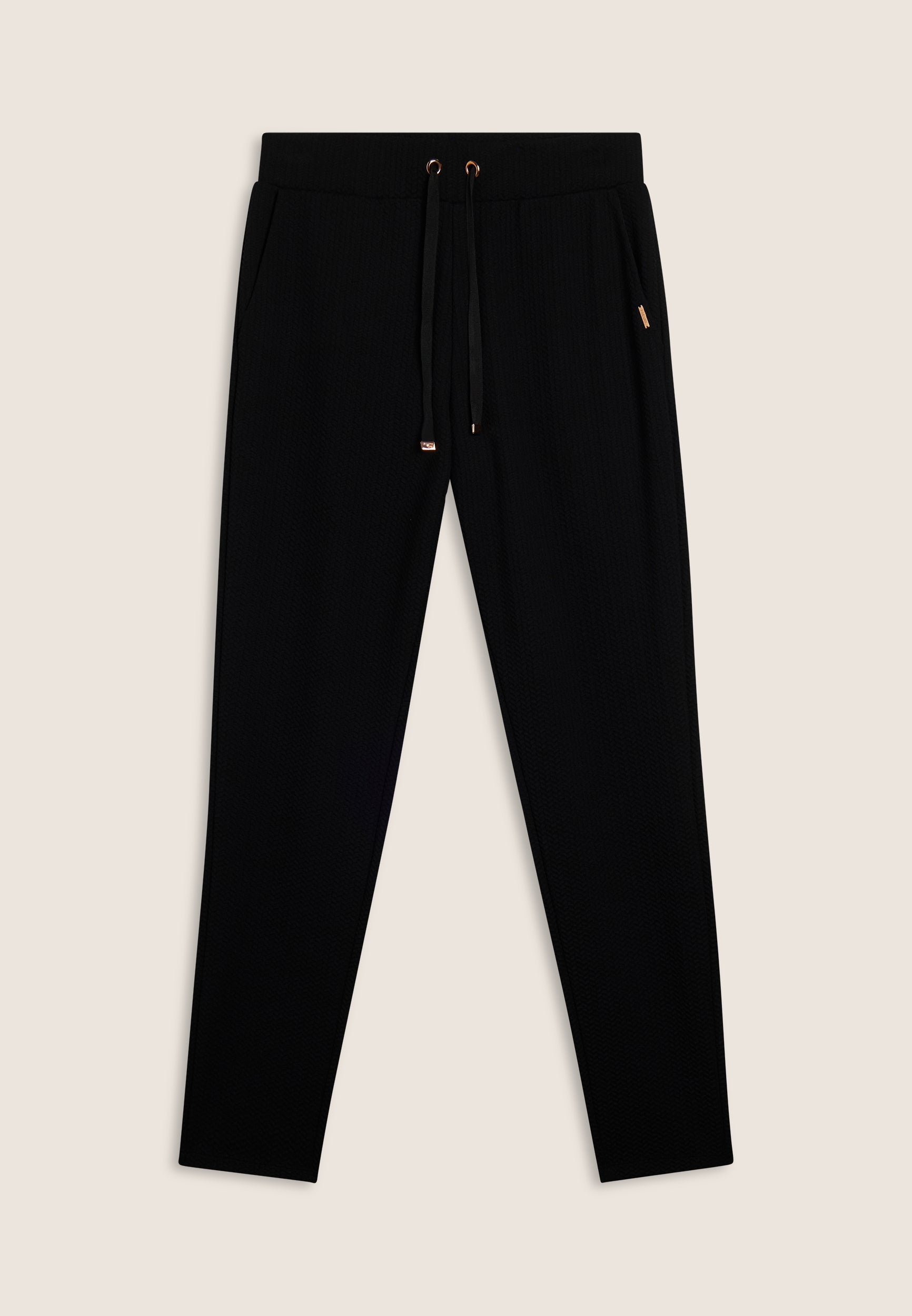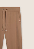Women's trousers with regular and comfortable fit, made entirely from double-layered performance fleece with sophisticated micro-braid texture. The regular waist has an adjustable drawstring for a customised fit. Straight bottom, comfortable and practical besom pockets, with FREDDY logo plaque applied discreetly to the edge of the left pocket.