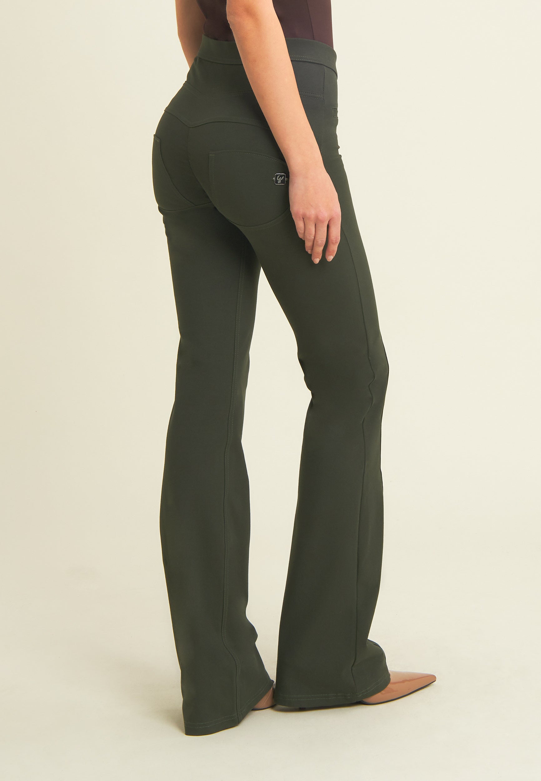 WR.UP® skinny push-up trousers with flared bottom in heavy organic stretch cotton jersey. Regular waist with V-cut and central zip. Central seams and mock front pockets give a casual-chic touch inspired by classic denim.