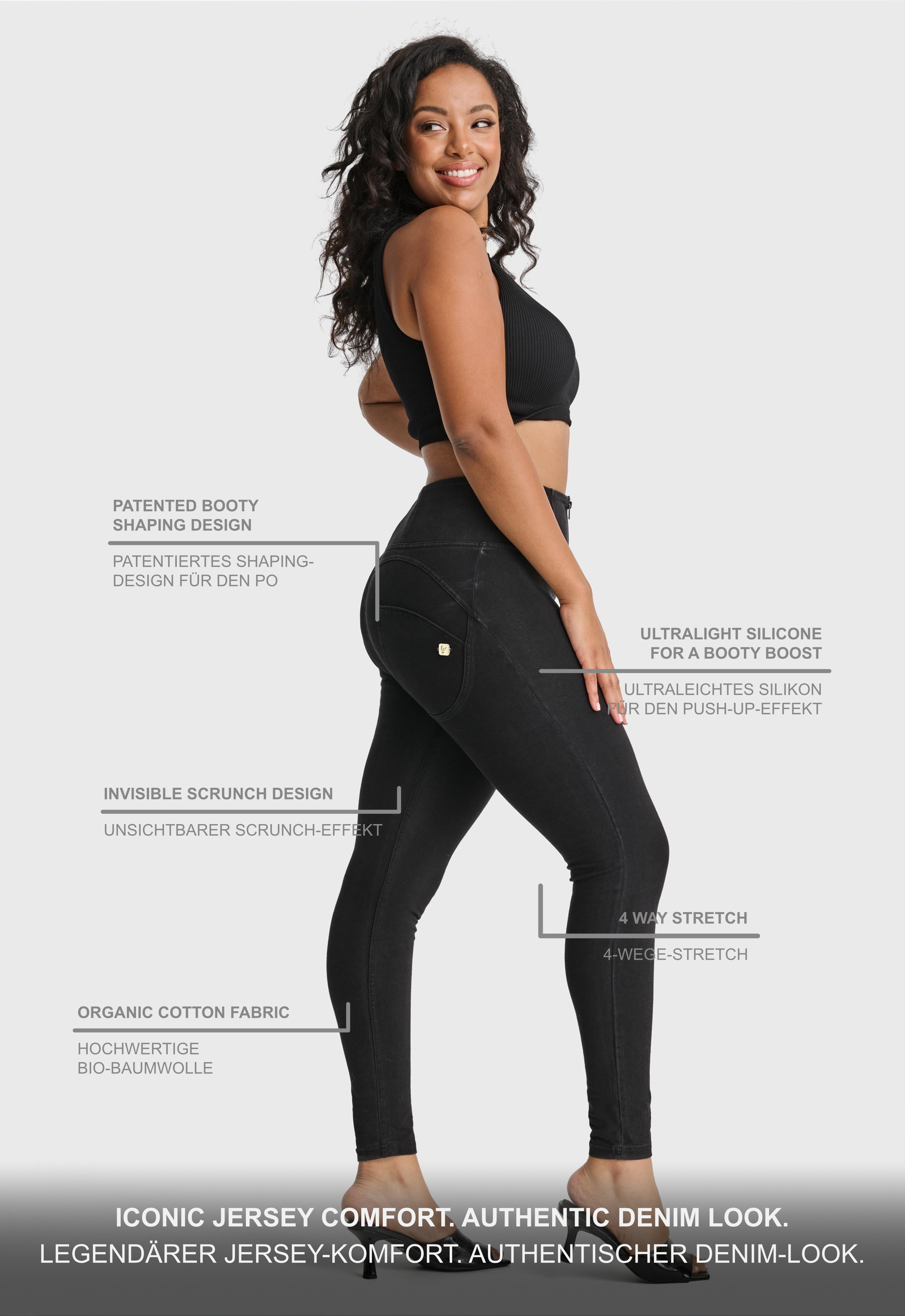 WR.UP® Pants i Svart: designade för att smickra och följa dina rörelser. De har en tidlös hellängd, perfekt för alla säsonger. Därtill kommer en smickrande hög midja som ger skönt stöd. Looken avrundas med en slank skinny-passform som smiter åt runt dina kurvor. Tillverkade i en kombination av en tidlös denimestetik med förbättrad komfort och flexibilitet. Som en del av WR.UP®-kollektionen har de patenterad teknologi designad för att naturligt framhäva och forma din silhuett. Italiensk design som utstrålar självförtroende och stil.